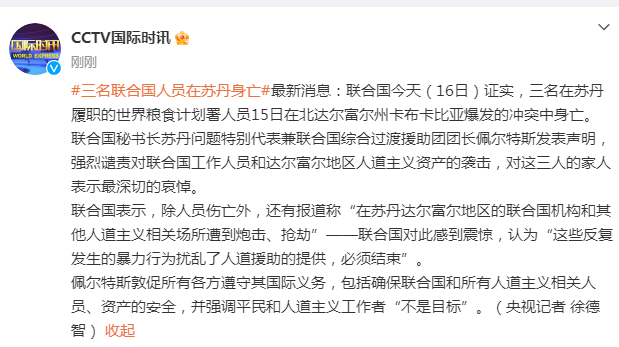 最新消息:联合国今天(16日)证实,三名在苏丹履职的世界粮食计划署人员15日在北达尔富尔州卡布卡比亚爆发的冲突中身亡。