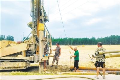 6月16日,工人在新华区香山街道筹备组徐洼村附近的农田里吊装钻杆准备打井。