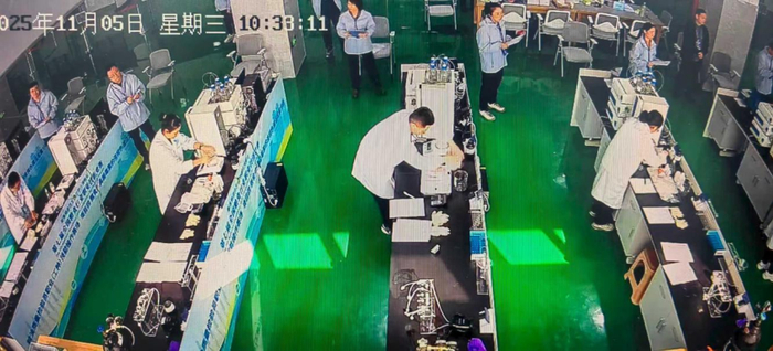 山东省粮油检测中心董斌(右二)参加质检项目实操的实时监控画面。