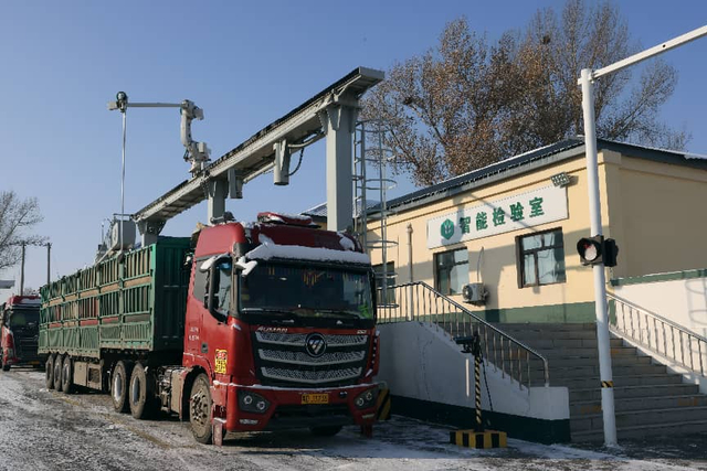 在中储粮哈尔滨直属库,智能扦检系统正在对送粮车进行随机扦样。