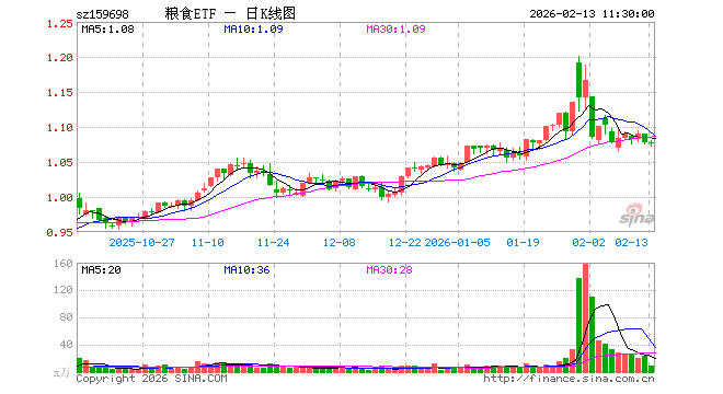 2月13日,截止午间收盘,粮食ETF(159698)跌0.28%,报1.075元,成交额961.59万元。粮食ETF(159698)重仓股方面,大北农截止午盘跌0.25%,隆平高科涨0.10%,北大荒涨0.00%,荃银高科涨0.00%,神农种业涨1.26%,藏格矿业跌1.25%,亚盛集团跌0.87%,农发种业涨0.83%,盐湖股份跌0.85%,云天化跌2.05%。